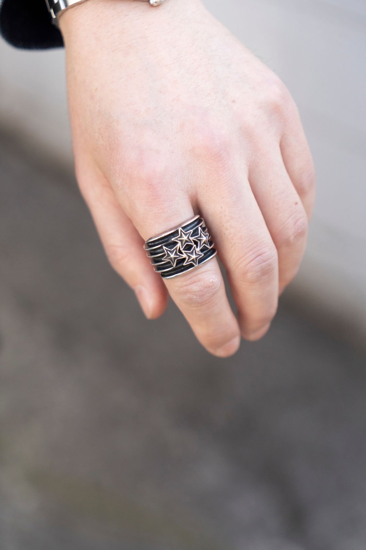 シンプルかつ上質な、大人の雰囲気漂う重ね着スタイル。ちらりと覗くリング、ブレスレット、そしてウォレットチェーンが、コーディネイトにアクセントを利かせている。