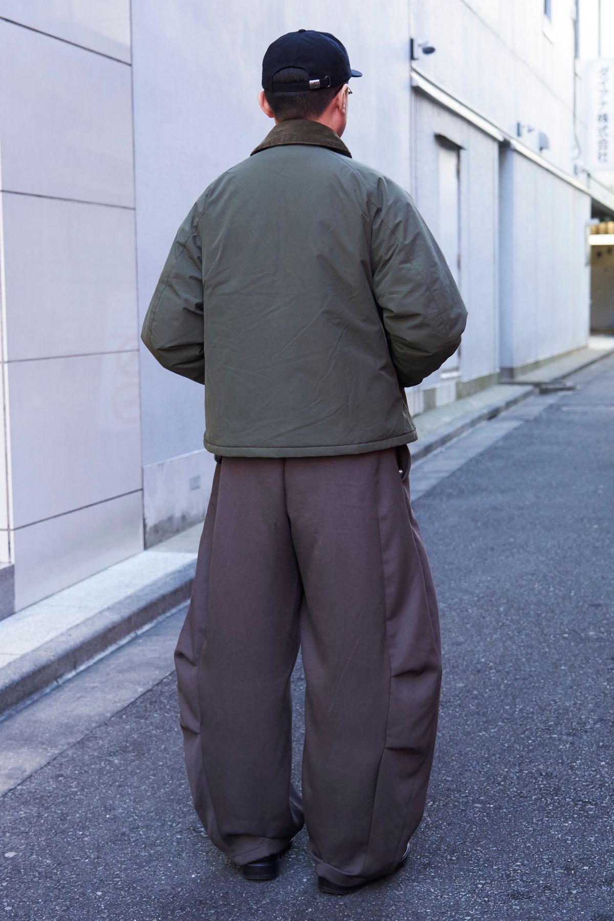 ボリュームあるシルエットのパラシュートパンツは、若々しさを演出してくれるボトムスのひとつ。トップスは、バブアーのジャケットにシンプルなリブニット。このようにタイトにまとめると、パンツの特徴が活きてくる。