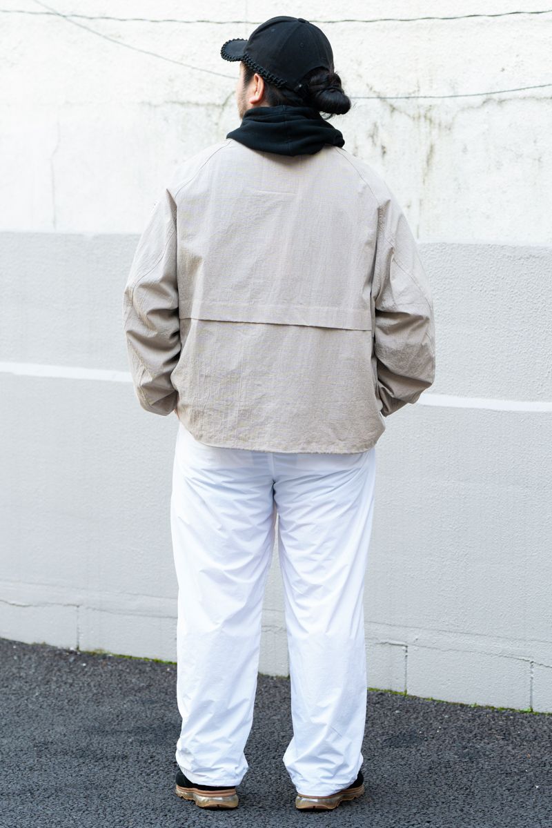 ジャケット、パーカ=ともにエレファントトライバルファブリックス パンツ=ヌルトウキョウ シューズ=エレファントトライバルファブリックス×トモアンドシーオー 帽子=ハッケイ ネックレス=不明 リング=スティーブアルビソ