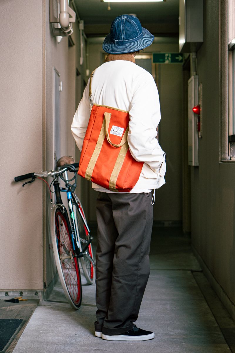 ジャケット=イージーミス パンツ=ディッキーズ シューズ=ステイトフットウエア 帽子=ミリタリー バッグ=ポーラー
