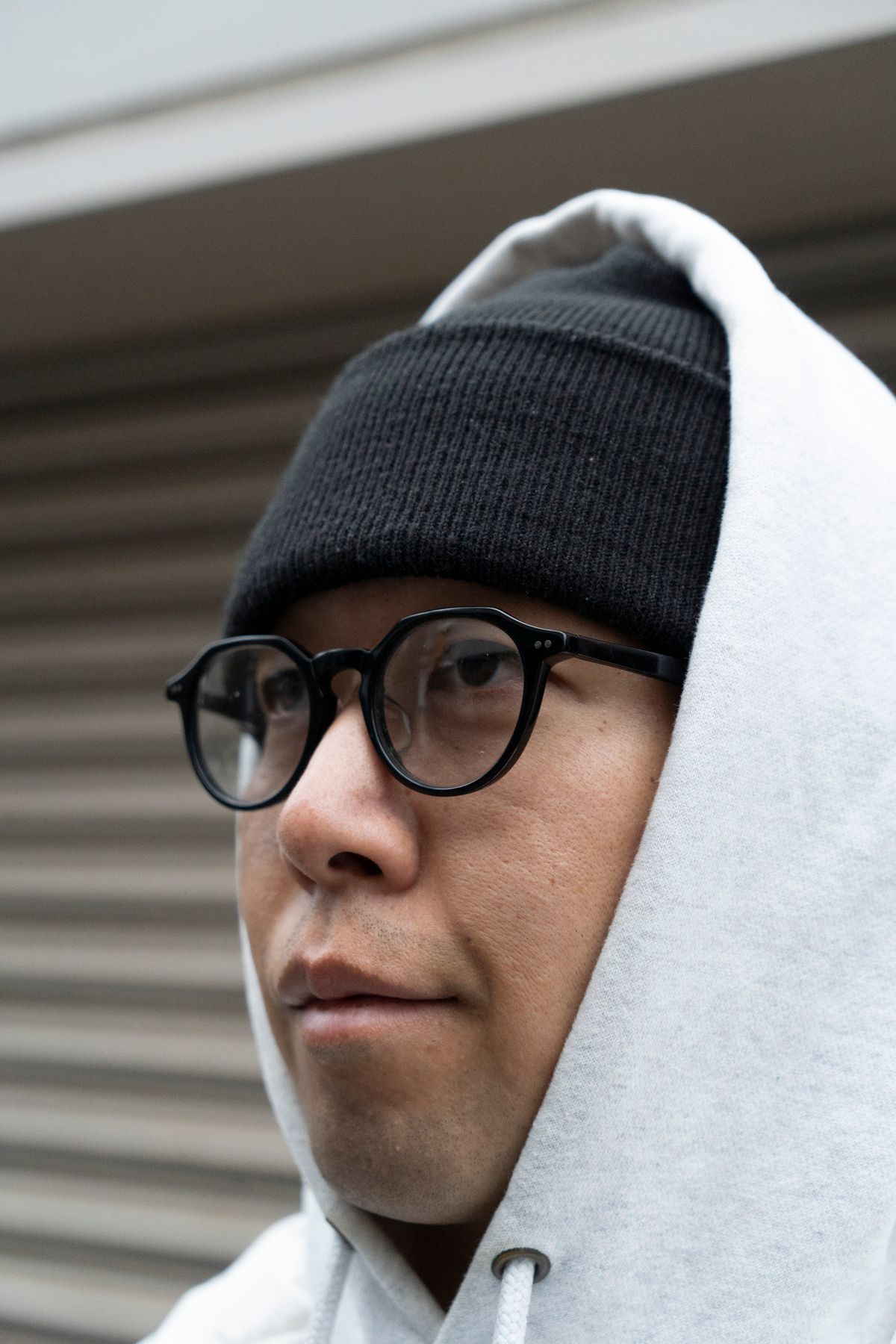 ジャケット=スティーブン アラン スウェット=GU パンツ=ユニクロ シューズ=コンバース 帽子=ノーブランド 眼鏡=ゾフ 腕時計=不明 リング=ニューニュー