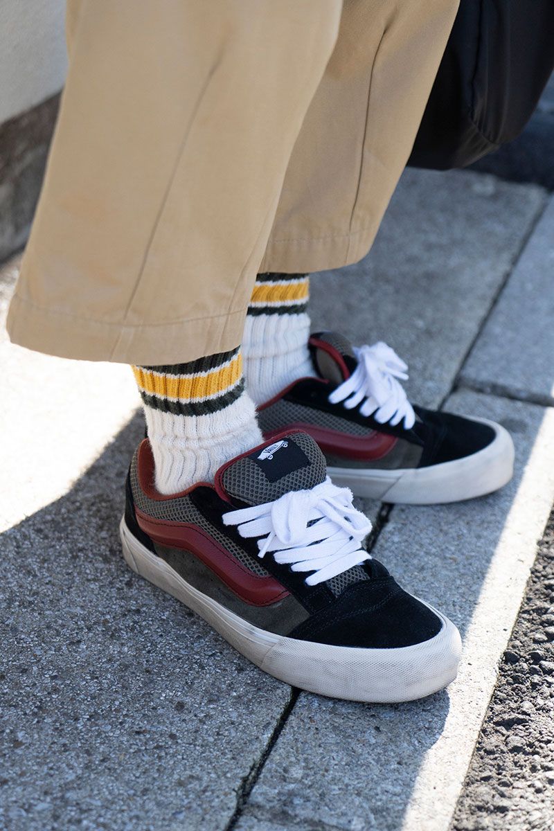 ジャケット、パンツ=ともに不明 カーディガン=ユニクロ シャツ=マーカウェア シューズ=ヴァンズ 帽子=カシラ 眼鏡=ジュガードフォーティーン バッグ=エヌハリウッド×アウトドアプロダクツ リング=ヴィンテージ