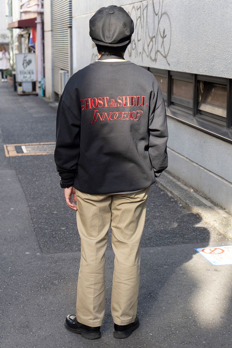▶︎上竹さんのスナップをすべて見る上竹明大さん(34歳)スウェット×チノーズという定番コーデ。『攻殻機動隊』のイラストがひと際目を引く。個性派トップスに合わせたパンツは、ディッキーズ×ワコマリアの共作だ。