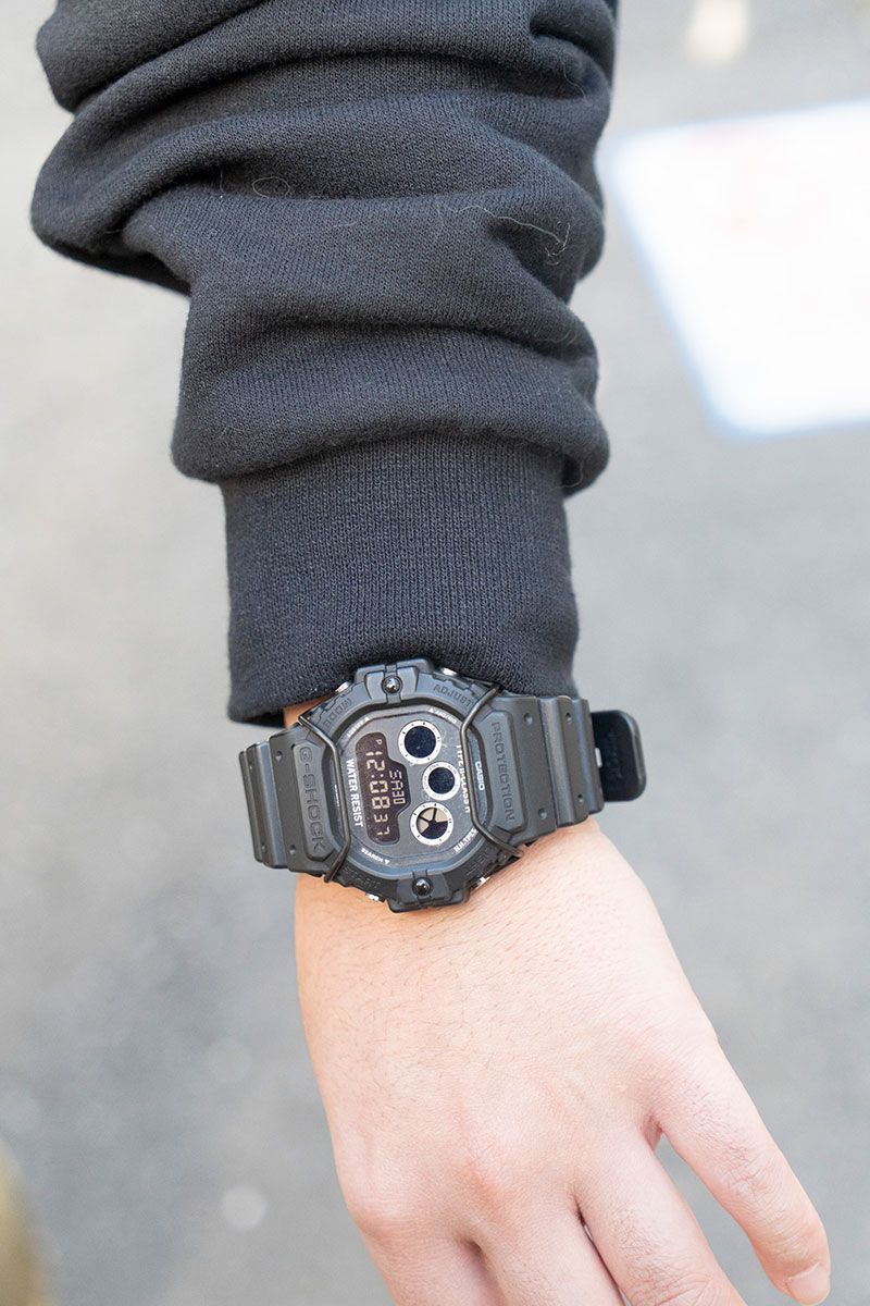 スウェット=ワコマリア パンツ=ワコマリア×ディッキーズ シューズ=パラブーツ 帽子=シーピーエイチ 眼鏡=モスコット バッグ=パレススケートボード×ポーター 腕時計=エヌハリウッド×カシオ リング=ティファニー リング2=トムウッド