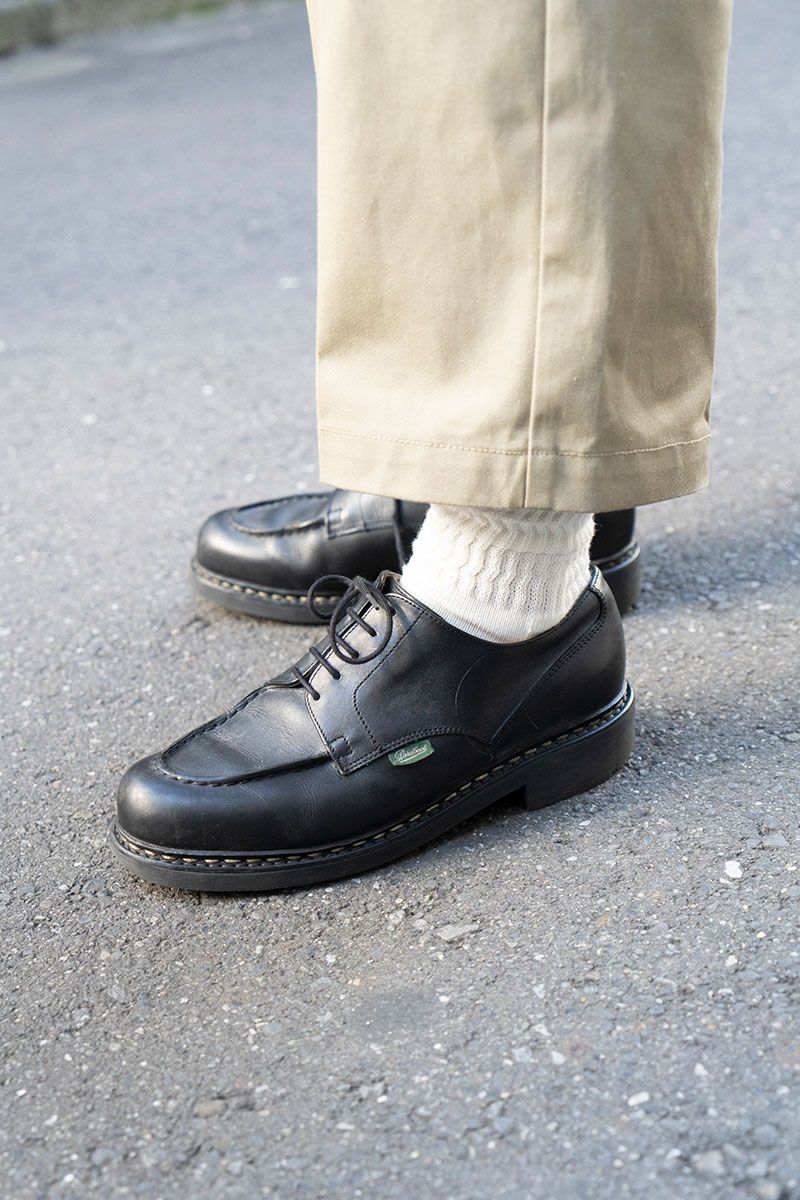 カジュアルな要素には、スニーカーを履きたいところ。しかし、彼はパラブーツを選択。締めるところは引き締め、装いを上品に仕上げた。