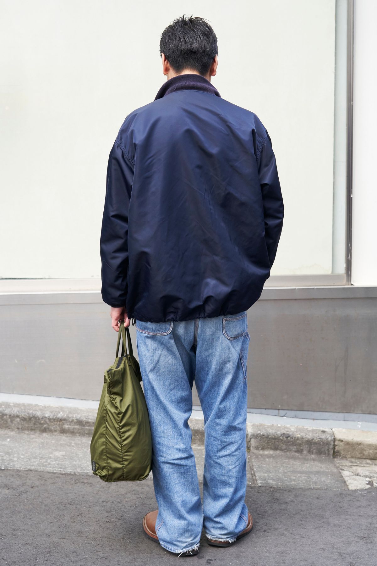 艶やかなネイビーのブルゾンと絶妙な色落ちのライトブルーのデニム、上下同系色で纏めつつメリハリを効かせている。