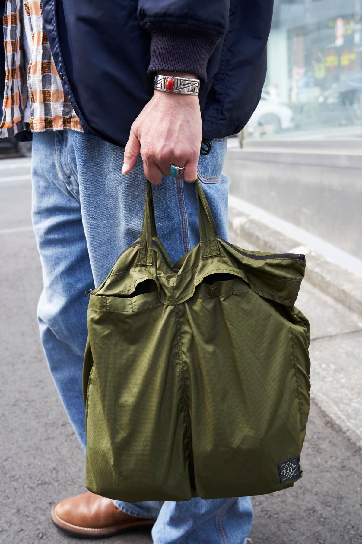 ブルゾン=ビームス プラス×エンジニアド ガーメンツ シャツ、Tシャツ、デニム=すべてビームス プラス シューズ=ビームス プラス×モト 眼鏡=アメリカン オプティカル バッグ=ポストオーバーオールズ ピアス=モト ネックレス、バングル、リング=すべて不明