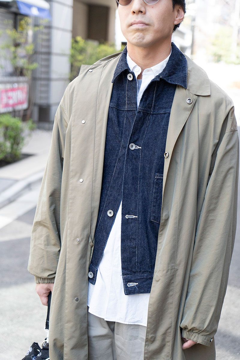 コーデの仕上げとして、すべてを包み込むように羽織ったのが「オーラリー」のコートだ。ベージュの色みもチノとリンク。本当にお上手。