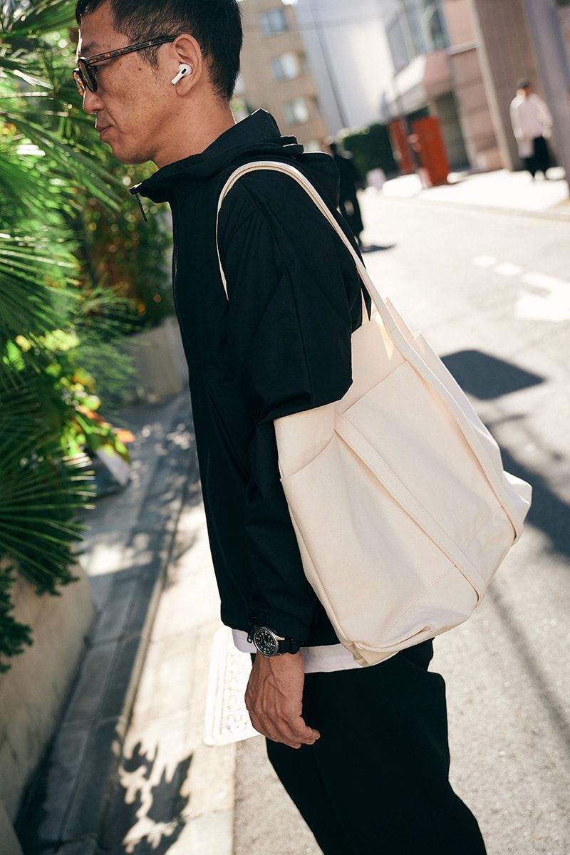 ▶︎上西さんのスナップをすべて見る上西弘之さん(42歳)ミニマルながらも抜群の機能性を有する、デサントオルテラインのナイロンアウターを主役に抜擢。アウターとパンツのブランドは異なるが、系統を合わせることで疑似セットアップを形成した。
