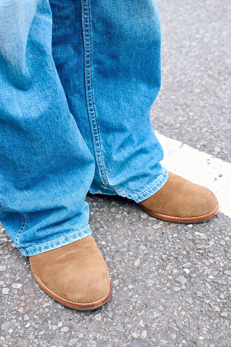 佐藤さんのそれは身幅も袖幅もたっぷりとった大胆なサイジングのフライトジャケット。ネック周りにもゆとりがあり、どこかすっきりとした印象だ。デニムもヒゲやあたりがしっかりと浮き出たいい頃合いの1本で、やや太めのワイドシルエット。たっぷりめなシルエットに見るその余裕が今の空気にマッチする。