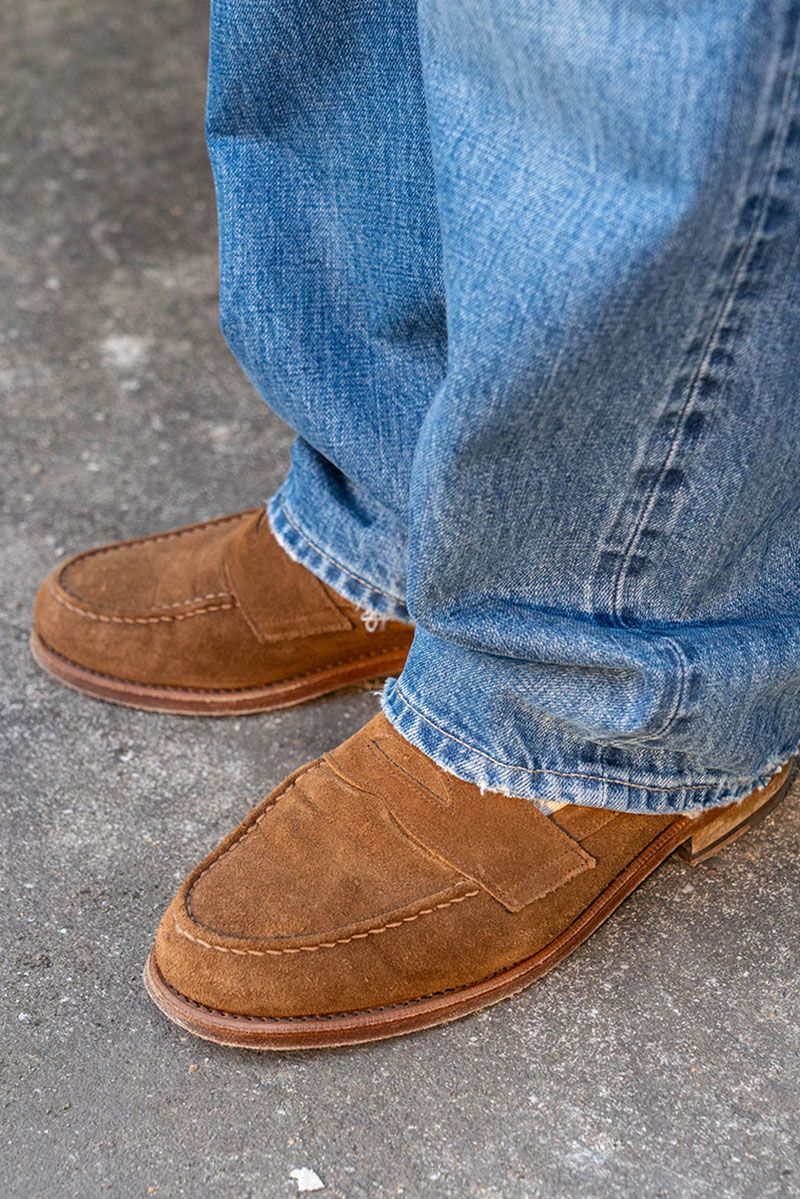 あとはそこへ自分なりのアレンジを加えていけばいい。紺ジャケ、ストライプシャツ、グランジ調のジーンズ、そしてスエードのローファー。それらのアイテムに鞍替えすることでステレオタイプからの脱却を図っている。