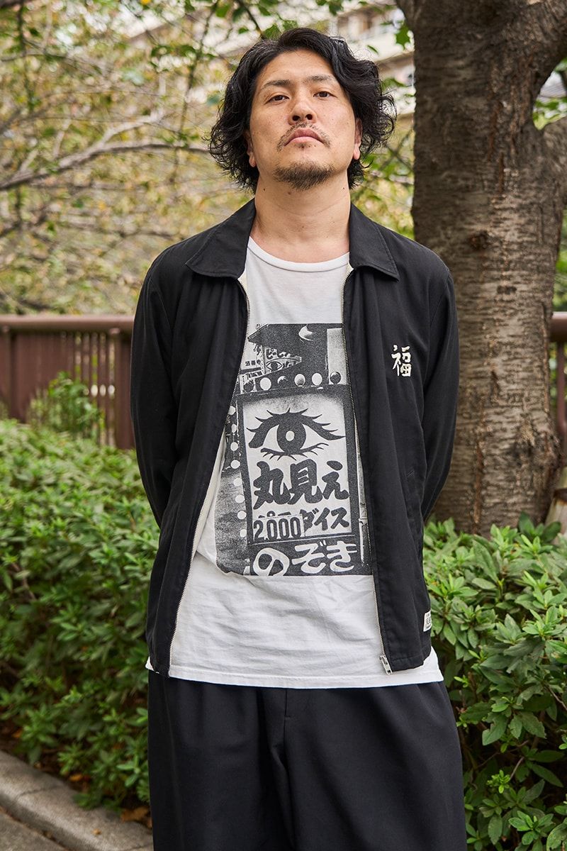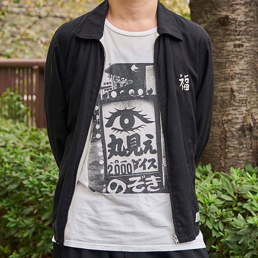 世界的写真家、森山大道氏の作品をプリントしたワコマリアの1着。とある繁華街に並ぶ看板を撮ったのだろうか。“丸見え”のワードやクローズアップした眼がどこかノスタルジーを誘い、周囲に与えるインパクトも絶大である。