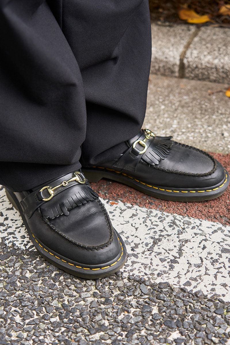 ▶︎寺澤さんのスナップをすべて見る寺澤 悠さん(42歳)肩肘張らないモードライクな出立ち。シューズも含めてオール黒で仕上げているだけに、白ベースのTシャツのプリントやキルトタンをあしらったビットローファーの異彩っぷりが余計に目を引く。そんな彼が手にしたTシャツは……。