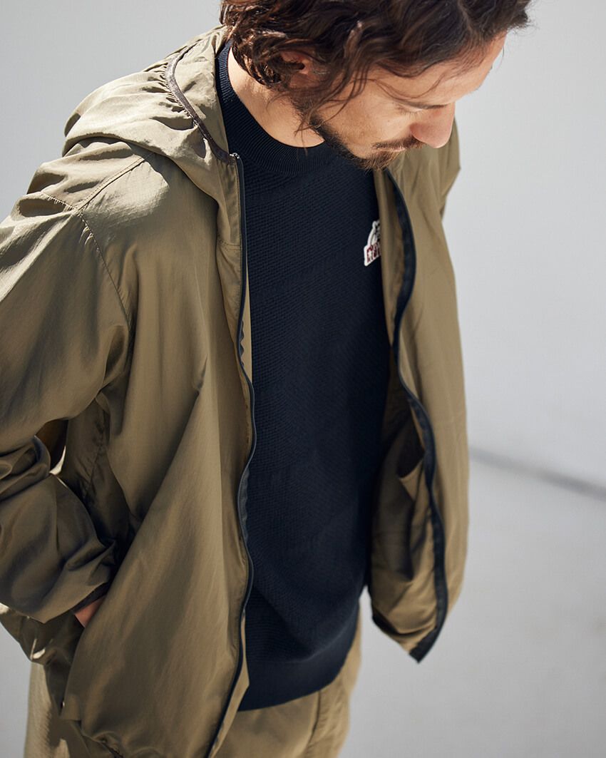 ボディには米軍の装備に使われる、ミルスペックに準拠したWリップストップ織りのナイロン生地を採用。薄手で軽量でありながら引き裂き強度に優れるこれを、ゆったりフィットのウィンドブレイカーへと落とし込んでいる。