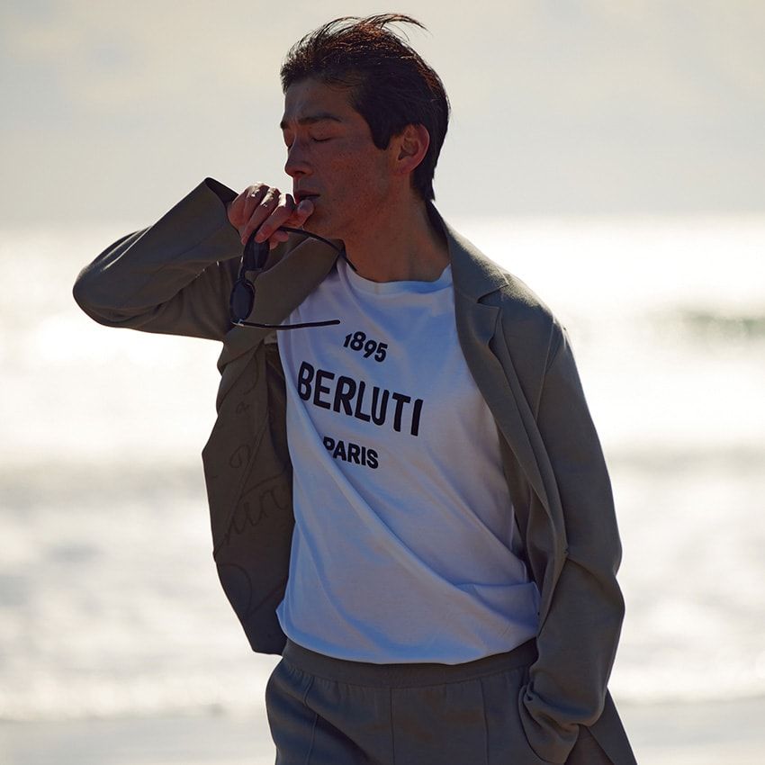 ジャケット31万2400円、パンツ23万2100円、Tシャツ9万7350円、スニーカー14万9600円、サングラス5万2800円、バッグ75万9000円/すべてベルルッティ 0120-961-859