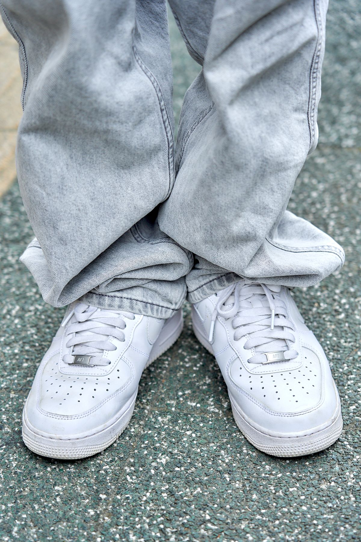 パンツの溜まった裾から覗くのは白のエア フォース 1。この装いの雰囲気に、非の打ち所がないほどハマっている。