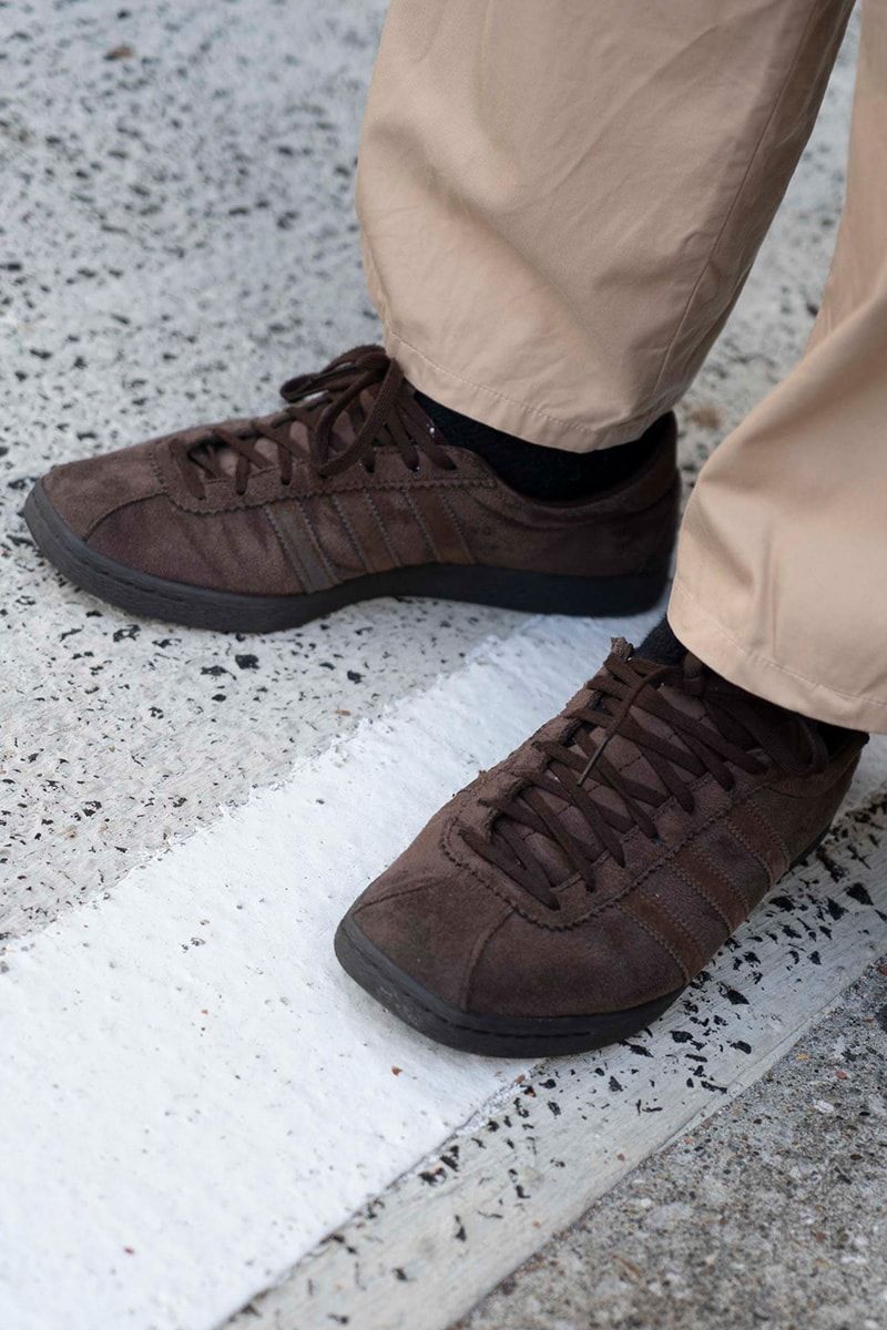 そこにベージュのチノやブラウンのローテクスニーカーを合わせてコーデを構築。上は黒主体、下は暖色で纏めて奥行きを出した。