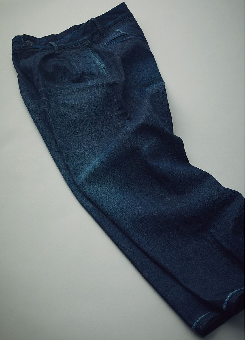 クリース入りの上品な顔立ちで、一見すると落ち着いた印象だが、適度なウォッシュ感や随所に施したダメージ加工が絶妙。