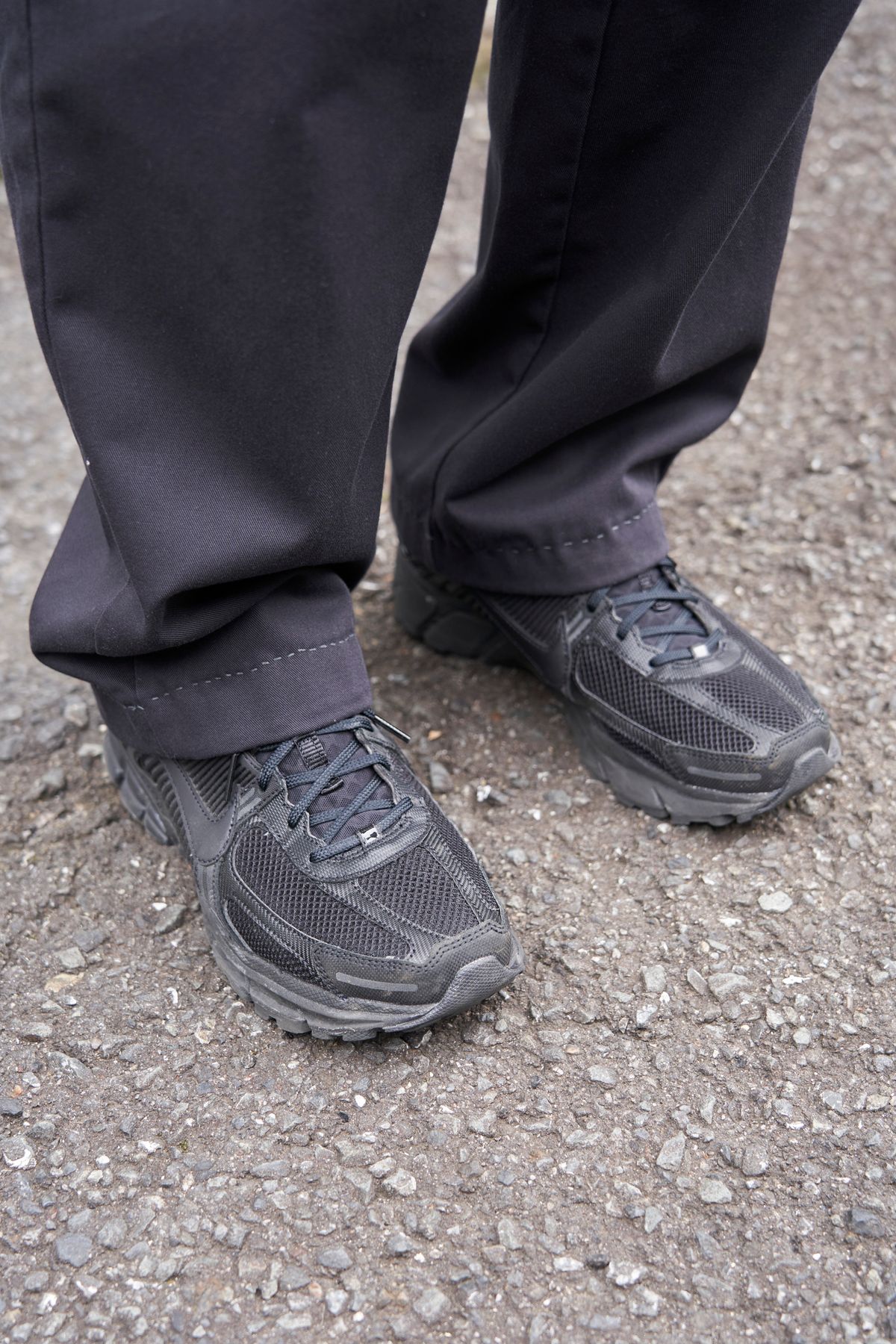 そんな彼の選んだパンツもレッドキャップ。こちらはストンと下に落ちるようなシルエットがいい感じだ。首から下げたウォレットがアクセ代わりのスパイスにもなっている。