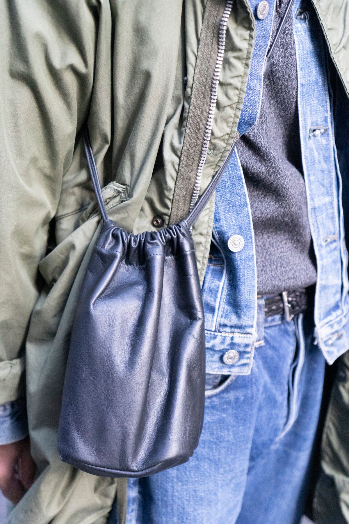 コート、ポロシャツ=ともに不明 Gジャン、デニム=ともにリーバイス シューズ=ジェイエムウエストン 帽子=古着 眼鏡=レスカルネティエ バッグ=ホーボー 腕時計=ロレックス ブレスレット=ティファニー