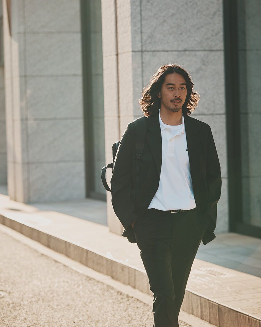 ブラックのセットアップスーツに、ホワイトの「L.12.12 ライト」をイン。クリーンな印象のビジネスカジュアルに。ポロシャツ1万7600円、ジャケット4万1800円、パンツ2万2000円、ベルト8800円/すべてラコステ 0120-37-0202、バック4万1800円/モノリス(モノリス アオヤマ 03-6805-0638)