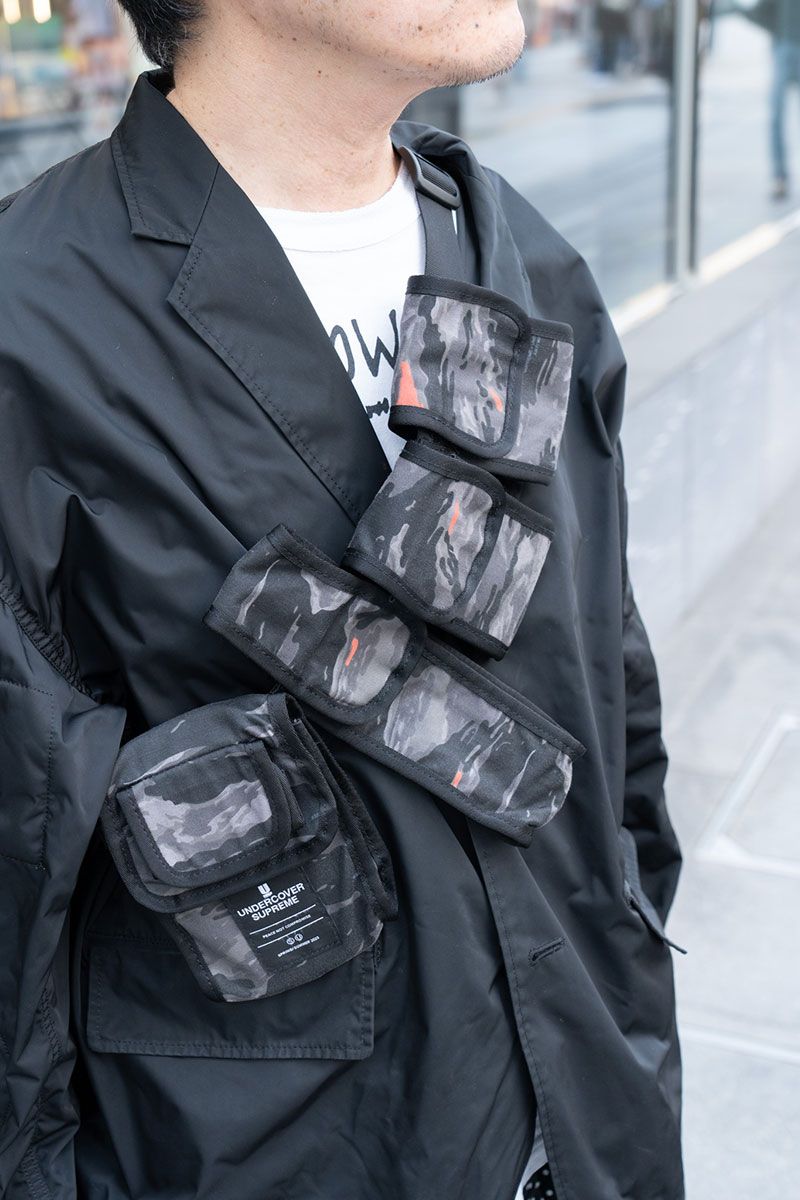ドットと迷彩というインパクトのある柄物を、パンツ&バッグで同時期用。黒主体のなかで際立つ両者は、前者がアンダーカバー、後者がアンンダーカバー×シュプリームのコラボレーションアイテムだ。