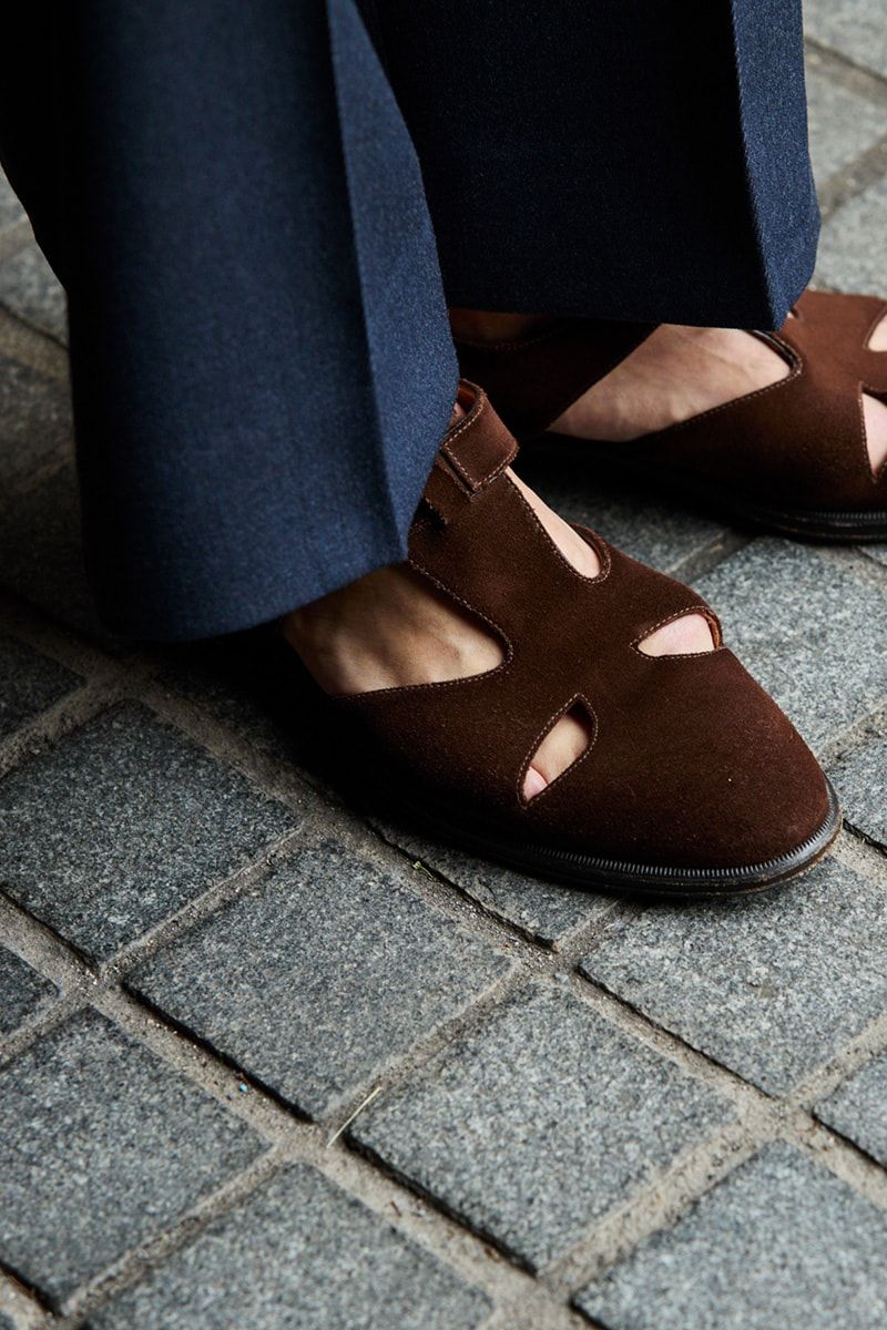 デザイン性のあるジャケットなら、白Tとのシンプルな組み合わせもこなれた印象に。ブラウンスエードのサンダルも大人っぽいチョイスだ。
