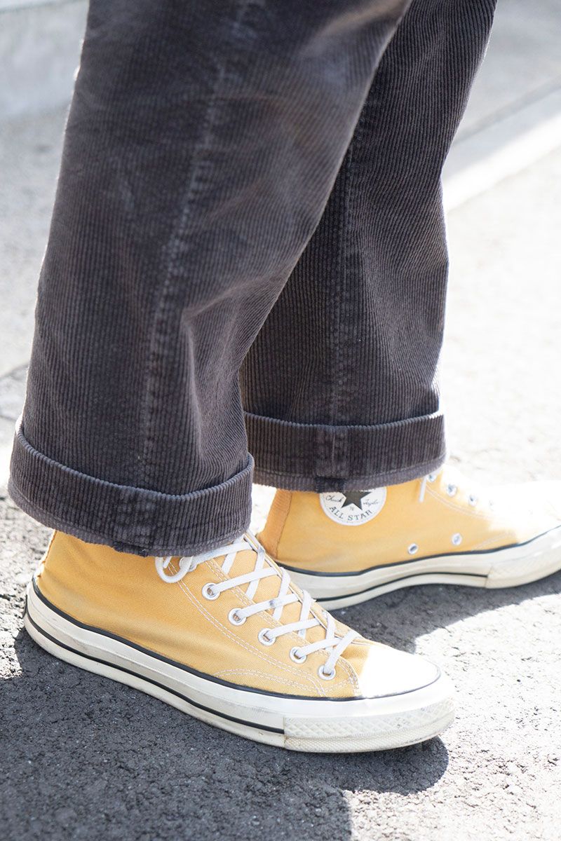 かたや、足元は少々ハッピーに。パンツの裾を軽くロールアップしたうえで、イエローカラーのハイカットを選択。ナチュラルな色彩ゆえ、全体のバランスも良好。