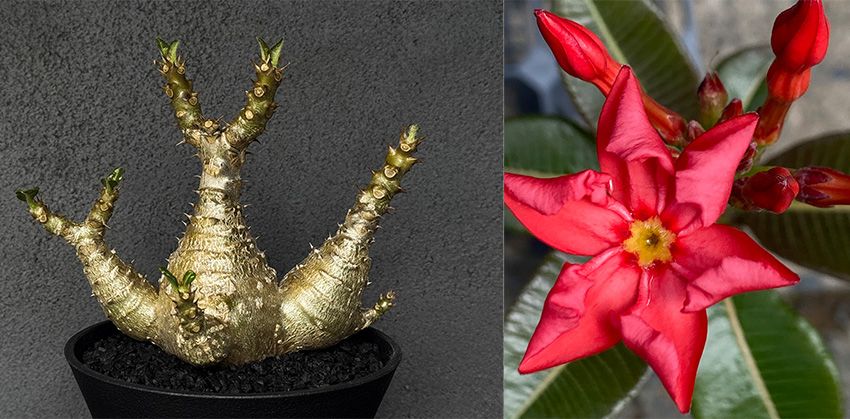「鮮烈な赤い花を咲かせる、マダガスカルの至宝です。球状の幹から細い枝が分かれ、先端に葉を付けます。育成の際は、寒さに弱い点に注意。良好な日当たり、風通しを好みます。夏場は屋外で育てられますが、冬場は室内や温室で育ててください」(靍岡十夢さん)。