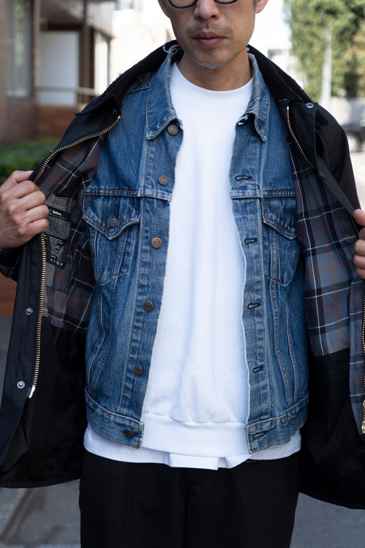 ▶︎福田さんのスナップをすべて見る福田満里夫さん(45歳)バブアーの“ビデイル”にディッキーズを合わせた上下ブラックスタイル。インナーにはリーバイスの短丈ジャケット、通称“サード”を抜擢し、程よく味が出たデニムカラーでコーデを彩った。