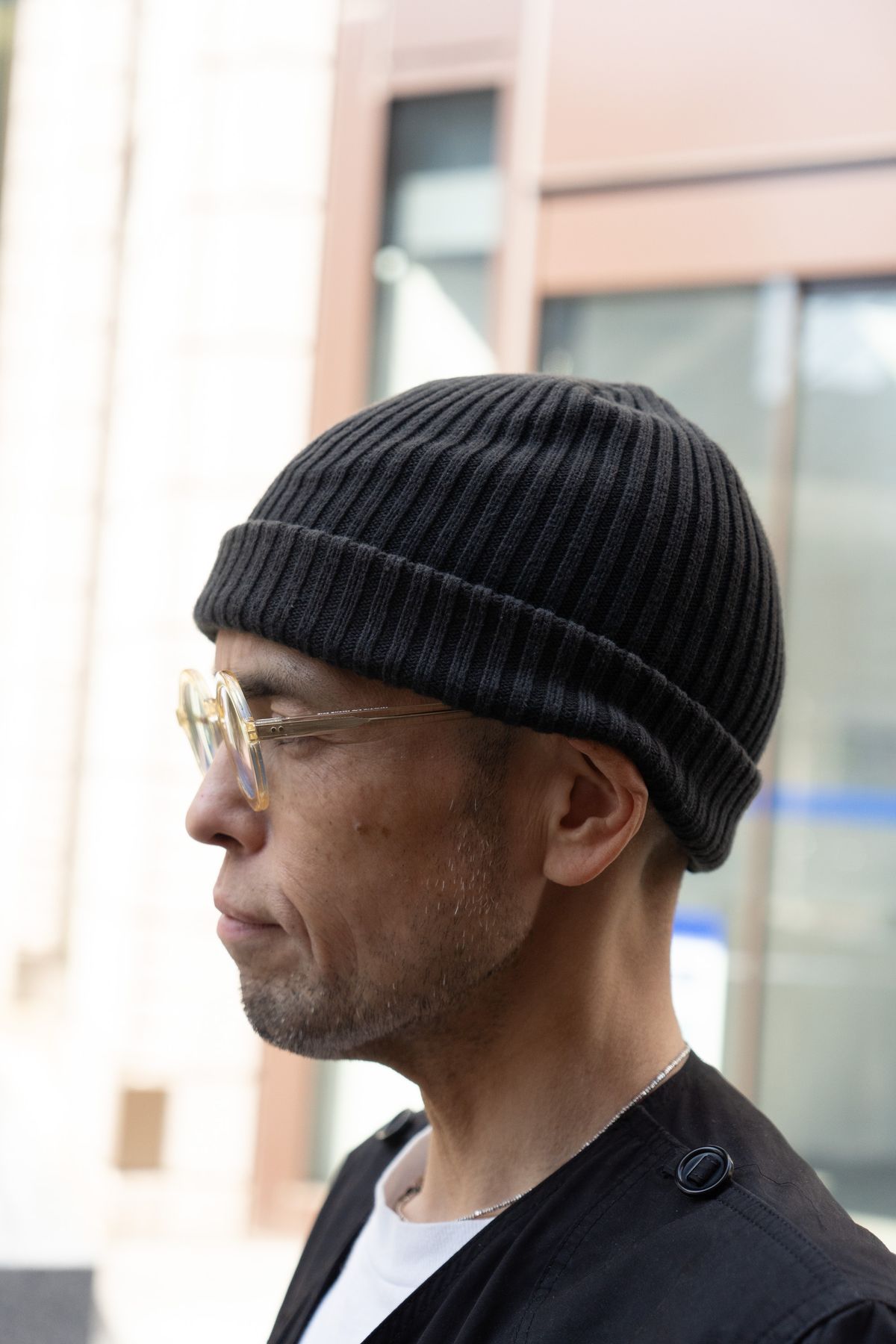 で、ニットキャップは「シンプルな装いの中にも存在感のある、 トータルコーディネイトで生きる帽子」を目指すキジマ タカユキで選抜。さらっと耳にかかる程度の無造作な被り方からも大人の余裕が滲む。