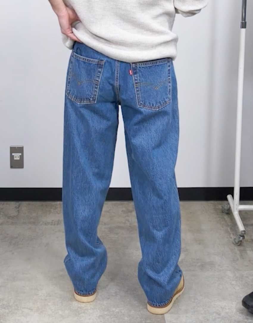 ササオカ(176cm、62kg)はリーバイス「578 バギージーンズ」の32インチを着用