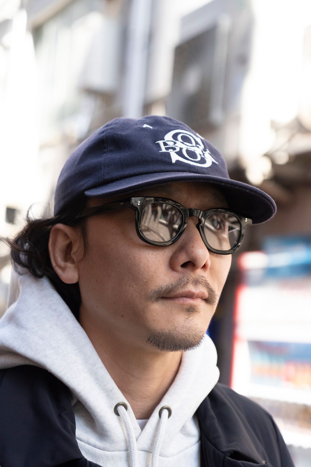 コート=エヌハリウッド スウェット、パンツ=ともにジーユー Tシャツ=ギルダン シューズ=ヴァンズ 帽子=フレッシュサービス 眼鏡=フュー