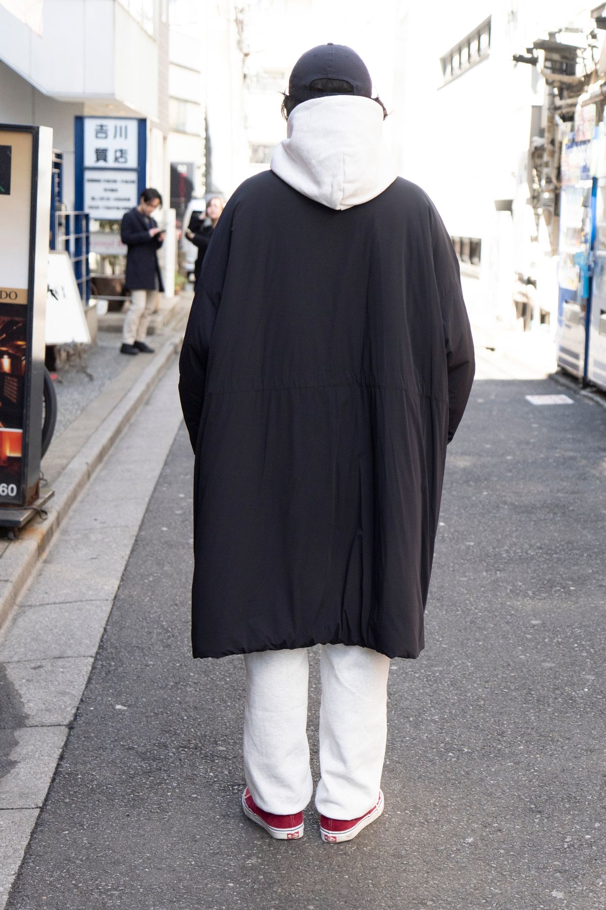 ▶︎友岡さんのスナップをすべて見る友岡翔太さん(37歳)最初に紹介した松岡さんと同じく、スウェットセットアップの上にコートを羽織った友岡さん。異なるのは、カラーの使い方。あえてスウェットとは反対色の黒、しかも素材感の違うナイロンコートを用いて、大胆にメリハリをつけた。