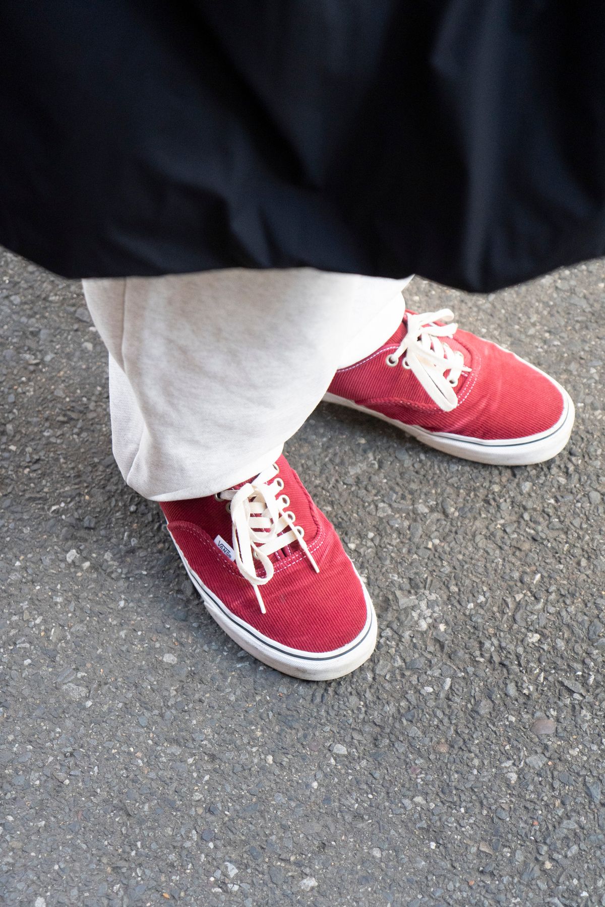 足元に真っ赤なヴァンズを持ってきて、コントラストの強さをさらに主張。立ち上がりのいいフードとキャップの相性も抜群で、実にこなれて見える。