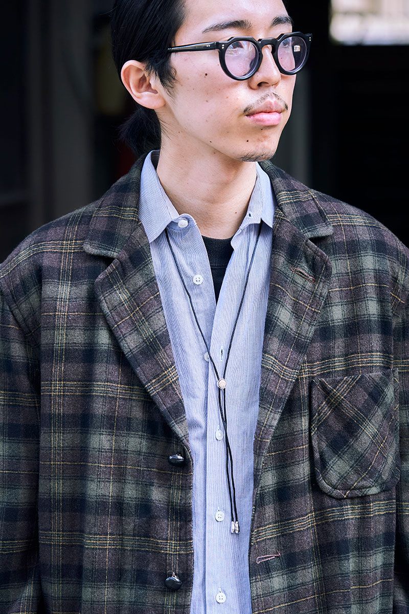▶︎酒井さんのスナップをすべて見る酒井弘治さん(25歳)渋みのあるチェック柄と、爽やかなブルーシャツ。ある意味で個性がぶつかり合うユニークな重ね着を、しっかりと受け止めるディッキーズの安心感たるや。