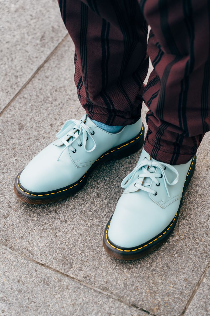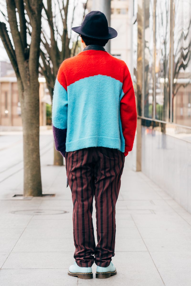 シューズでトップスのカラーを拾い、パンツでさらに別色を加えるなど、バランスの取り方とハズし方も強烈、個性的。タダモノではない。