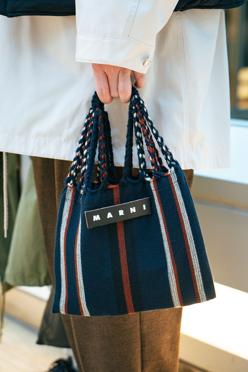 となれば、ミニバッグも色彩豊かなモデルを。ストライプとハンドルの織り柄が楽しいマルニのニットバッグで、いい大人に相応しい柔らかな印象も獲得。