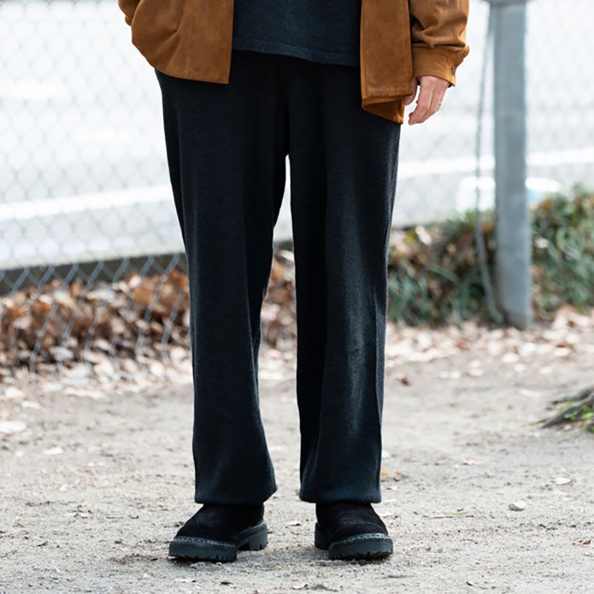 レザーとニットの表情がクラス感を生み、ブラックとブラウンの足し算で落ち着きを獲得。で、ワイドなイージーパンツのナチュラルテーパードでスッキリ仕上げ。さすが。