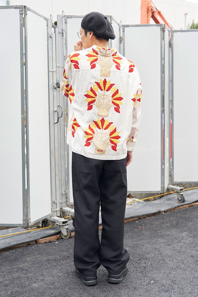 ▶︎岡田さんのスナップをすべて見る岡田りんたろうさん(43歳)いつも同じ服ばかりだと老けちゃうぜ! と言わんばかりの個性派コーディネイト。その中心に居座るのが、どデカイ花柄の刺繍を全面に配したアートな開襟シャツだ。