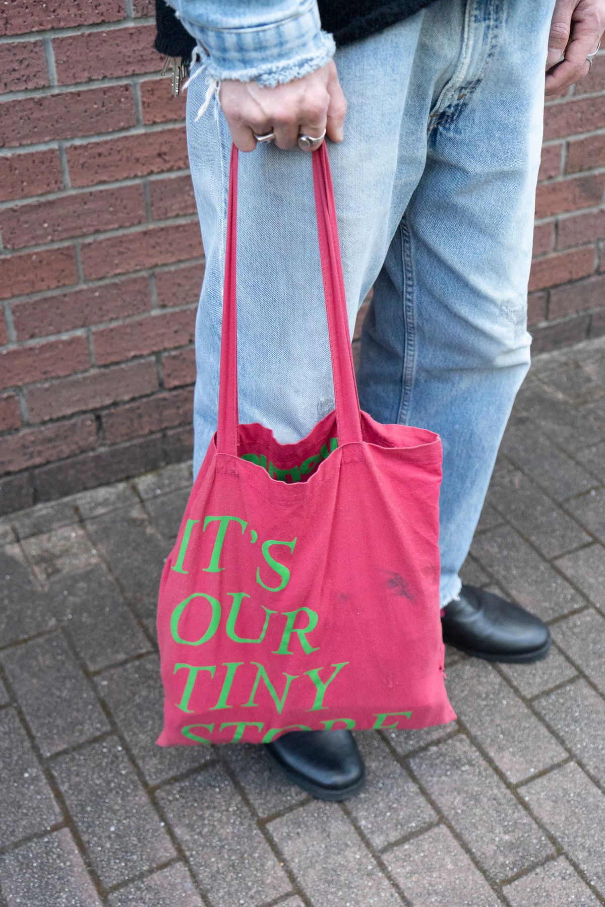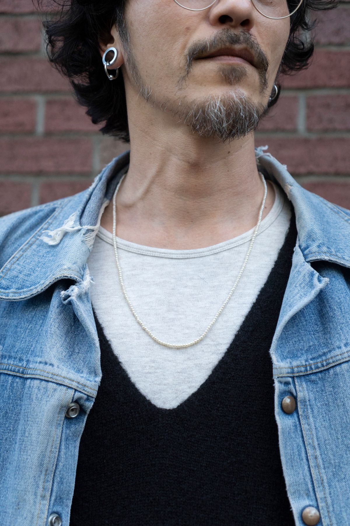 Gジャン、Tシャツ、デニム=すべて古着 ニット=イーティーエスマテリオ シューズ=ビーミング by ビームス 眼鏡=シュロン バッグ=ノーブランド ネックレス=不明 リング=メゾン マルジェラ リング2=シハラ