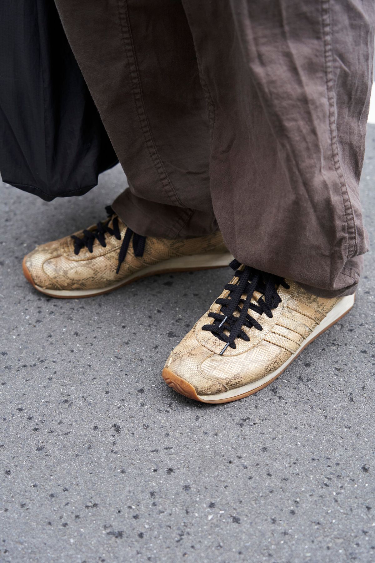 なかでもタカハシさんが選んだのは、両胸にコミカルなグラフィックがあしらわれた1着。黒の襟付きのシャツをレイヤードし、上半身をブラックでまとめた。ボトムスやシューズはブラウン系で統一し、纏まりのあるコーディネイトを完成させた。