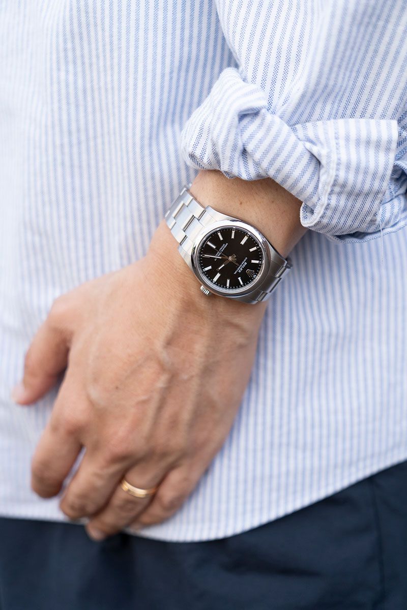 シャツ=ブルックスブラザーズ パンツ=アプレッセ シューズ=ニューバランス 帽子、バッグ=ともにエルエルビーン 腕時計=ロレックス リング=エルメス