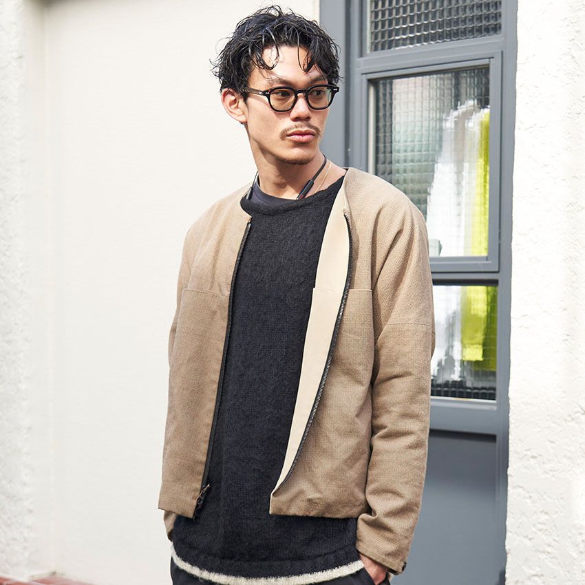 ジャケット=サンシー ニット=ネーム パンツ=ジュエラーズ シューズ=古着 眼鏡=ディグナクラシック リング=ジュエラーズ