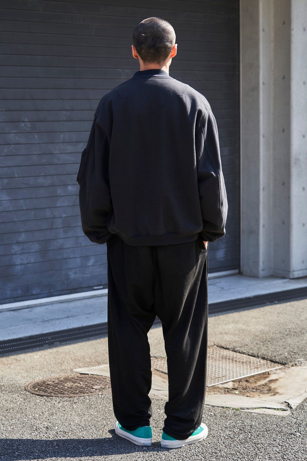 サーフスケートカルチャー由来の「ジャクソンマティス」のボンバージャケットを主役に抜擢。股上の深い黒パンツを合わせて、肩肘張らないリラクシングなスタイルを構築した。