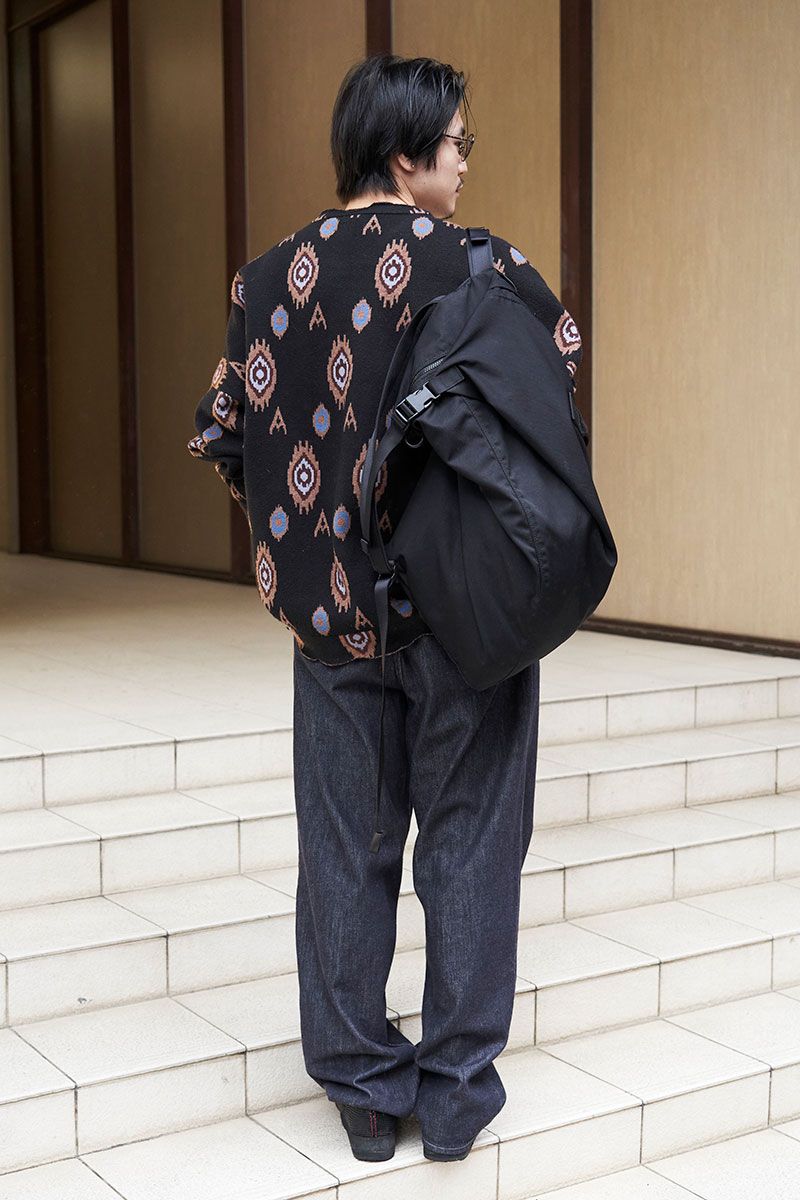▶︎KAIさんのスナップをすべて見るKAIさん(30歳)ひと目で印象に残る、個性派ニット。コーデの主役は間違いなくトップスだ。が、それを引き立てる名脇役にもご注目を。