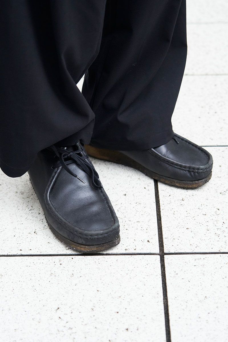 選んだのはユニクロの黒スラックス。特性上、キレイめに寄りすぎる恐れもあるが、極太のシルエットを抜擢することで見事カジュアルに落とし込んだ。