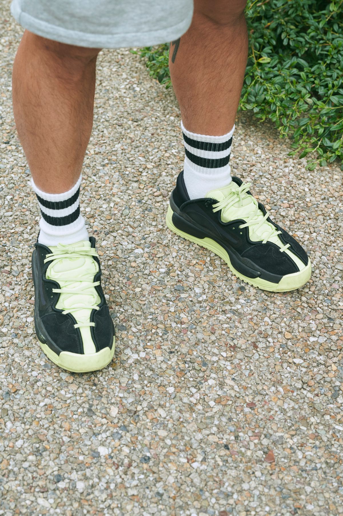 トドメにライトグリーンとブラックがインパクト大な「ワイスリー」の一足を。モードなテイストを足元で加え、カジュアル一辺倒を回避するあたり上級者とお見受けする。