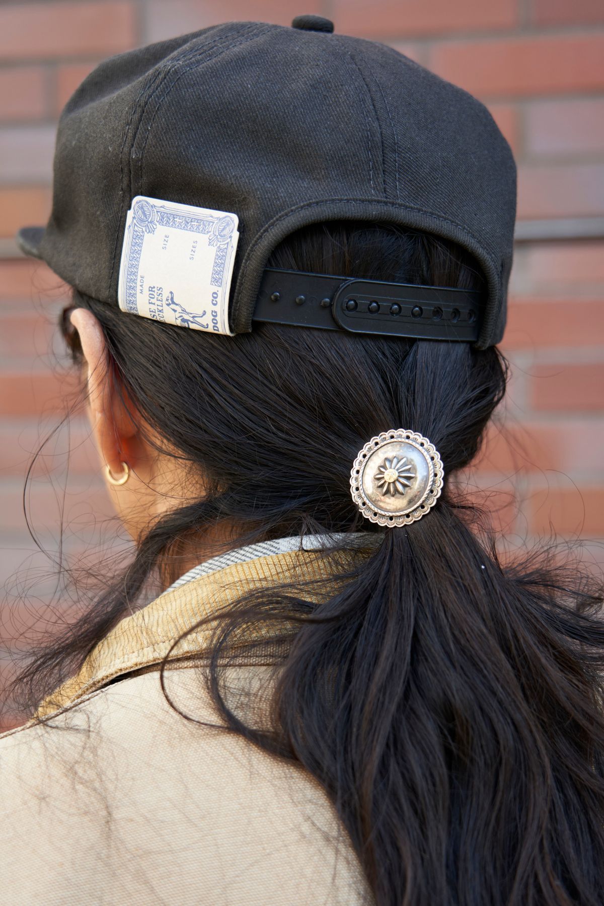 スウェット、チェックシャツ、カバーオールを重ね、トップスも王道感たっぷり。仕上げに、ちょっとルードなキャップで個性出し。実にこなれている。