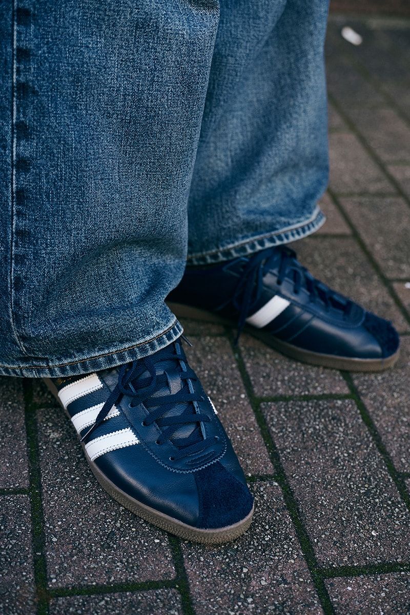 ジャケット=ヨーク デニム=ラングラー インナー=クレプスキュール スニーカー=アディダス オリジナルス